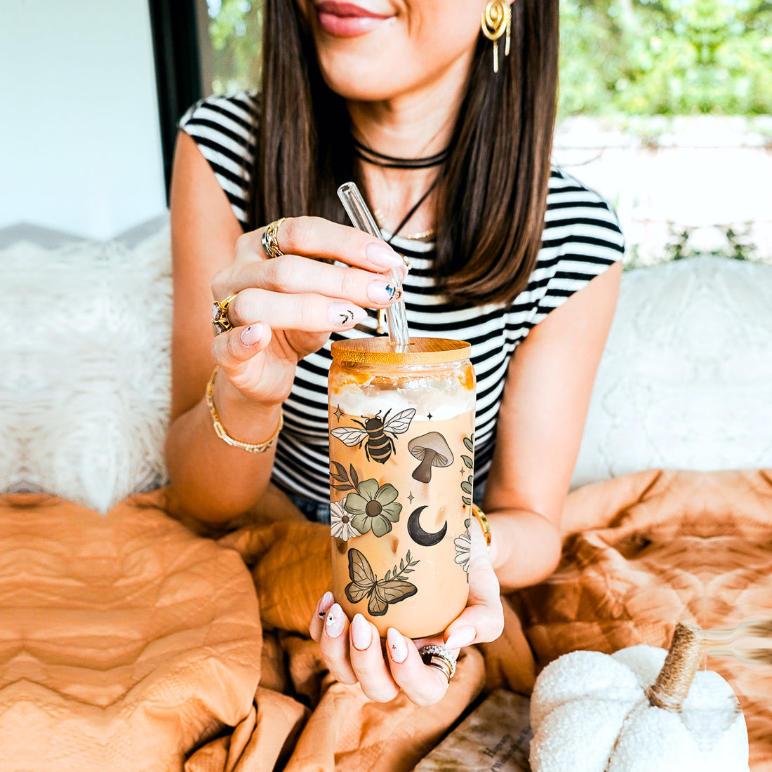 Our glasses with bamboo tops.Ā Drink it with the top and straw of choice, remove the bamboo lid and drink straight from the glass.